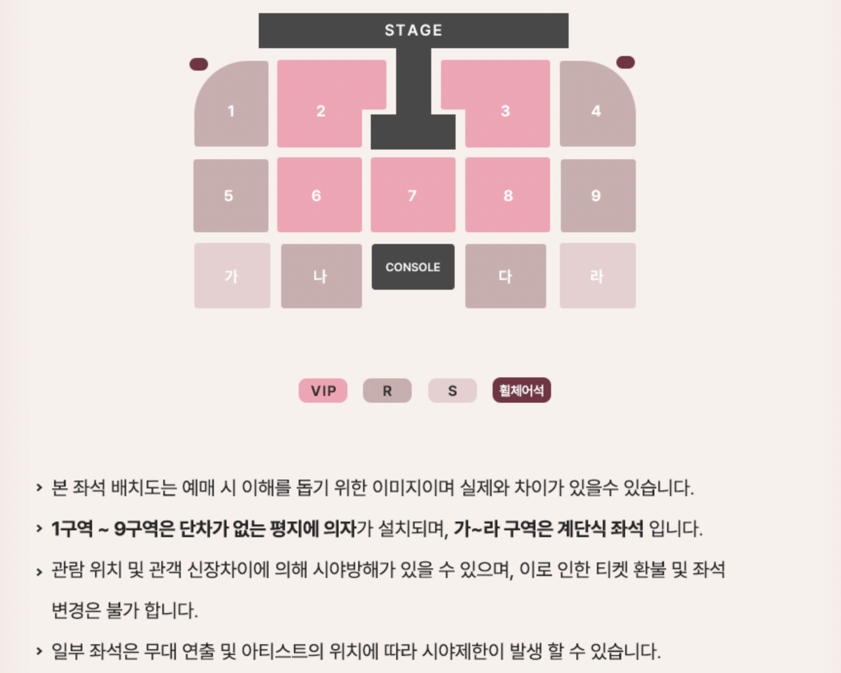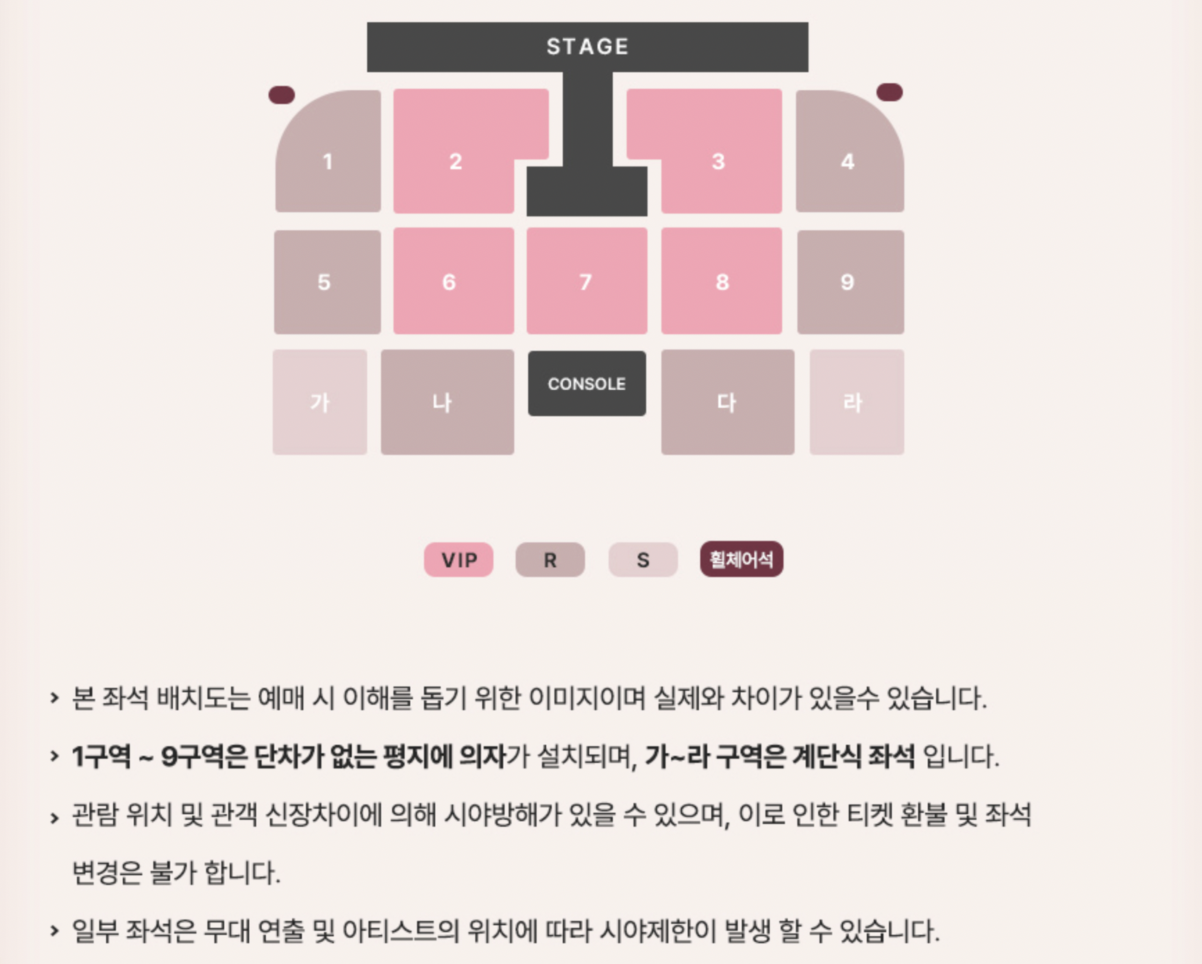 - 좌석 구성: VIP / R석 / S석 등 구분 (공연장별 상이)